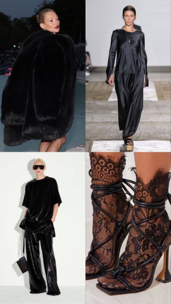 Jak stylistka vysvětlila, díky struktuře a lesku vypadá černý outfit nejelegantněji. Proto můžete docela sebevědomě zvážit možnosti od kožešiny, sametu, flitrů až po organzu, hedvábí a krajku.