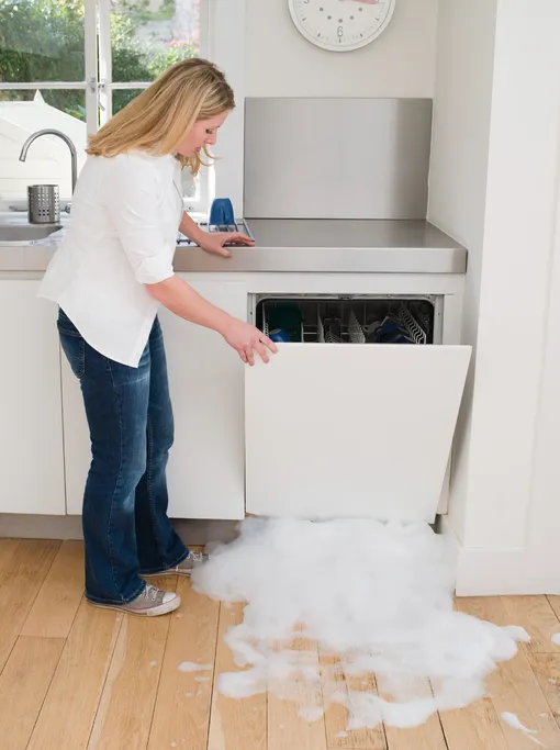 Jakmile si všimnete, že ze všech prasklin začala vytékat pěna, je třeba myčku okamžitě vypnout a vytáhnout ze zásuvky. Možná jste měli ještě čas a pěna se nedostala na elektronické řídicí jednotky PMM.