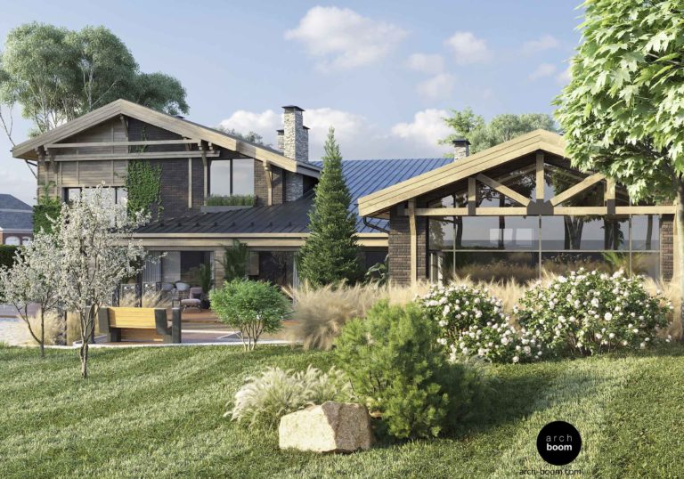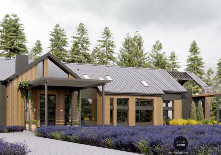 Projekt soukromého domu ve stylu horské chaty s bazénem o celkové ploše 700 m2