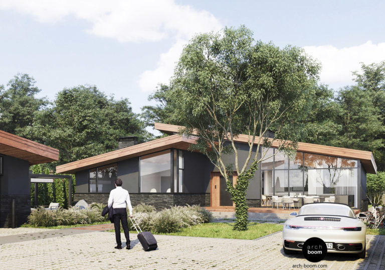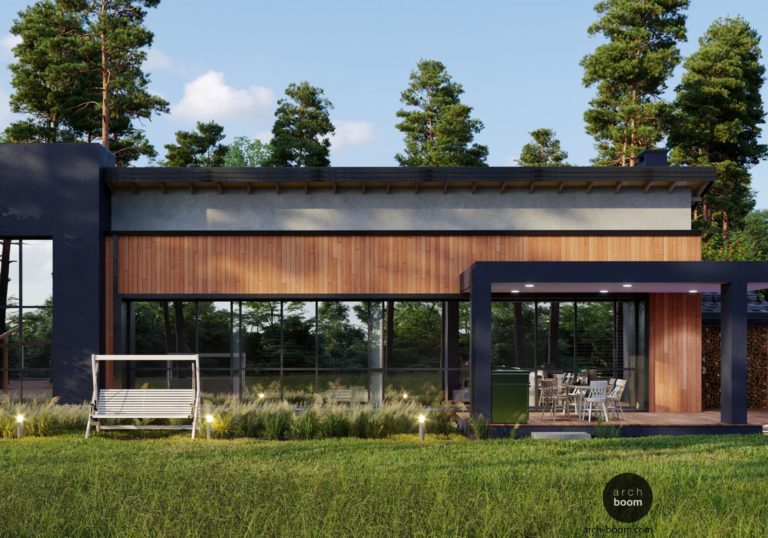 Projekt jednopodlažního domu s panoramatickým prosklením jižní fasády