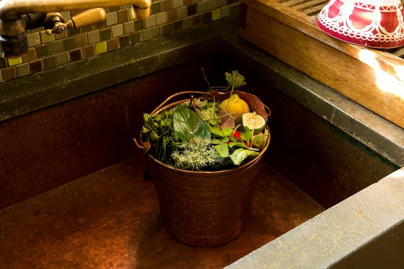 Šéfkuchařka Alice Watersová má ve svém kuchyňském dřezu kbelík kompostu. Berkeley, Kalifornie.